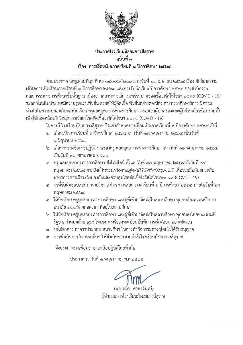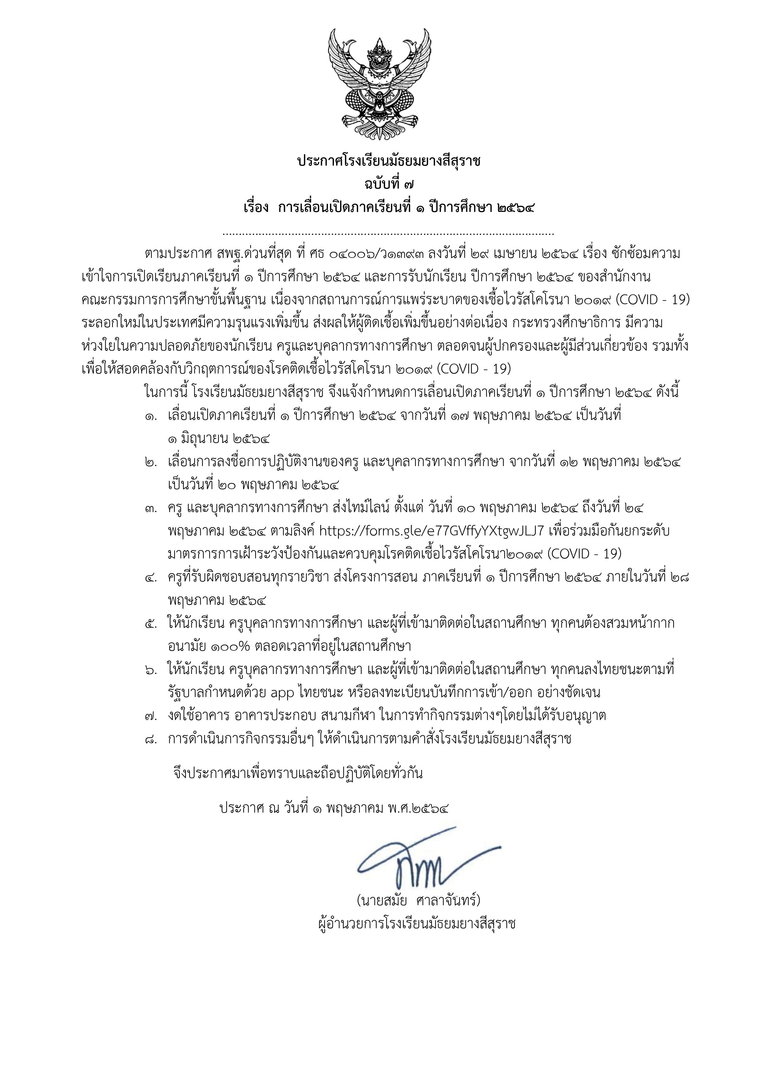 ประกาศโรงเรียนมัธยมยางสีสุราช ฉบับที่ ๗ เรื่อง การเลื่อนเปิดภาคเรียนที่ ๑ ปีการศึกษา ๒๕๖๔