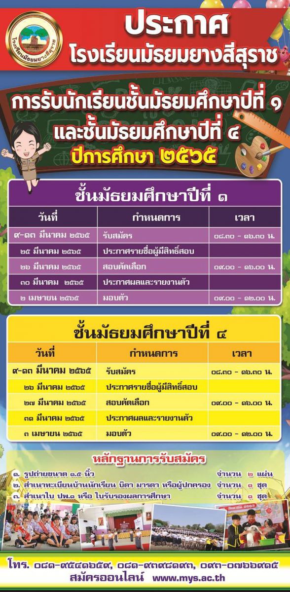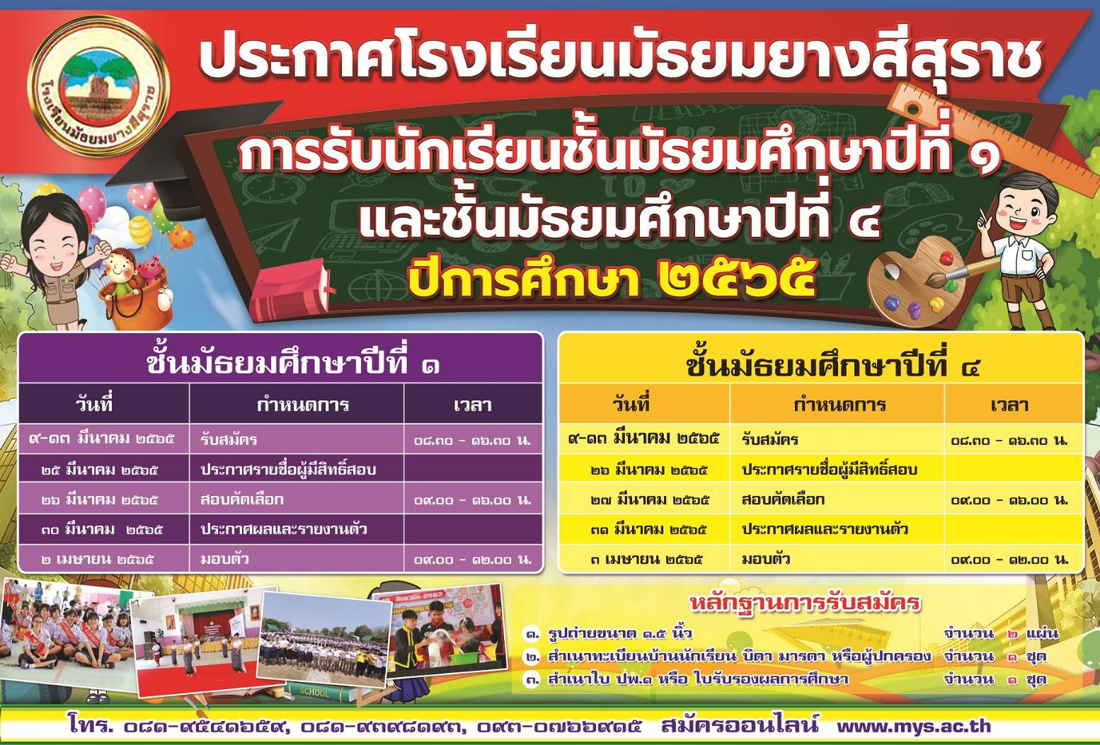 ประกาศโรงเรียนมัธยมยางสีสุราช เรื่อง การรับนักเรียนชั้นมัธยมศึกษาปีที่ ๑ และ ชั้นมัธยมศึกษาปีที่ ๔ ปีการศึกษา ๒๕๖๕