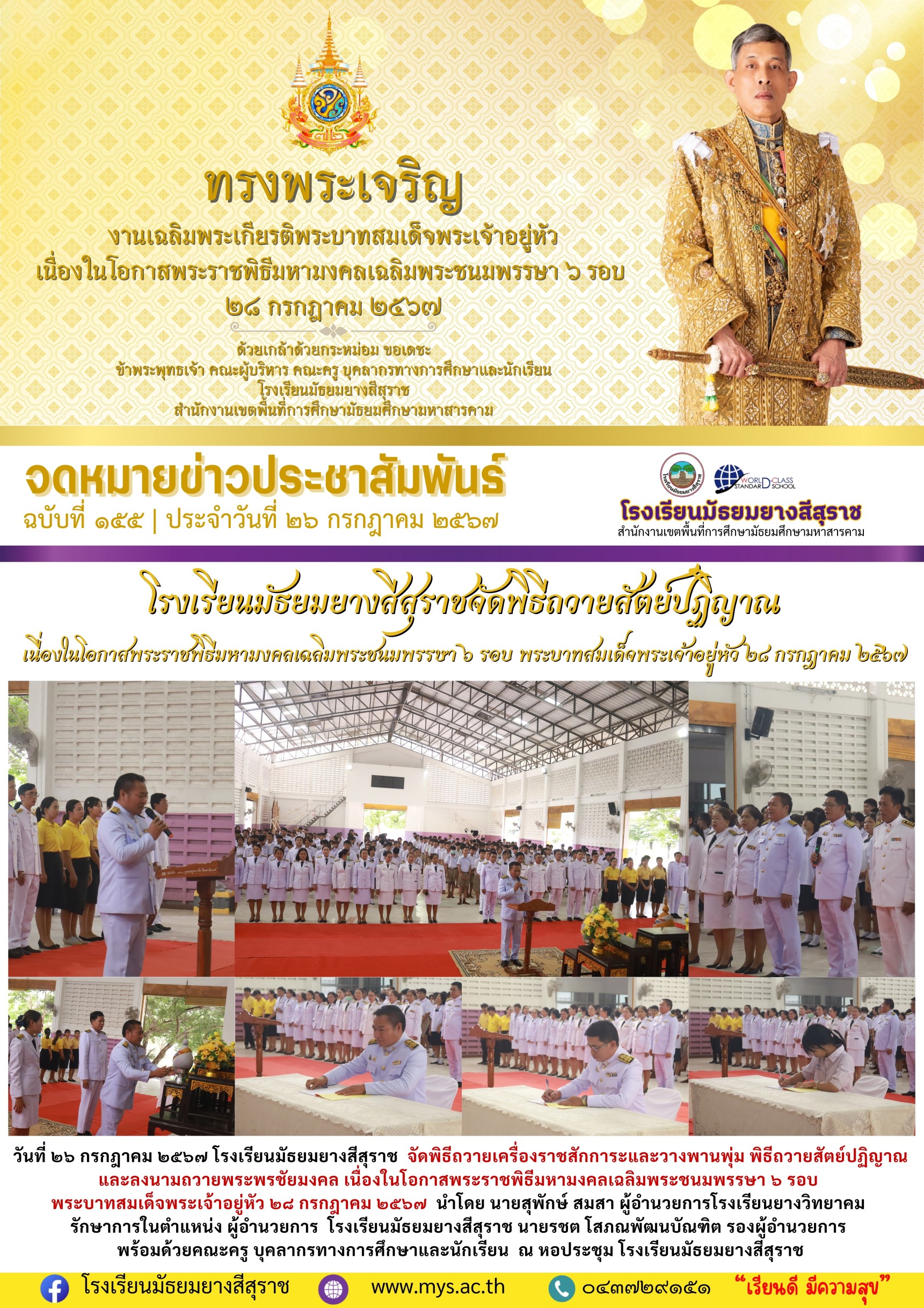 วันที่ ๒๖ กรกฎาคม ๒๕๖๗ โรงเรียนมัธยมยางสีสุราช จัดพิธีมหามงคลเฉลิมพระชนมพรรษา ๖ รอบ